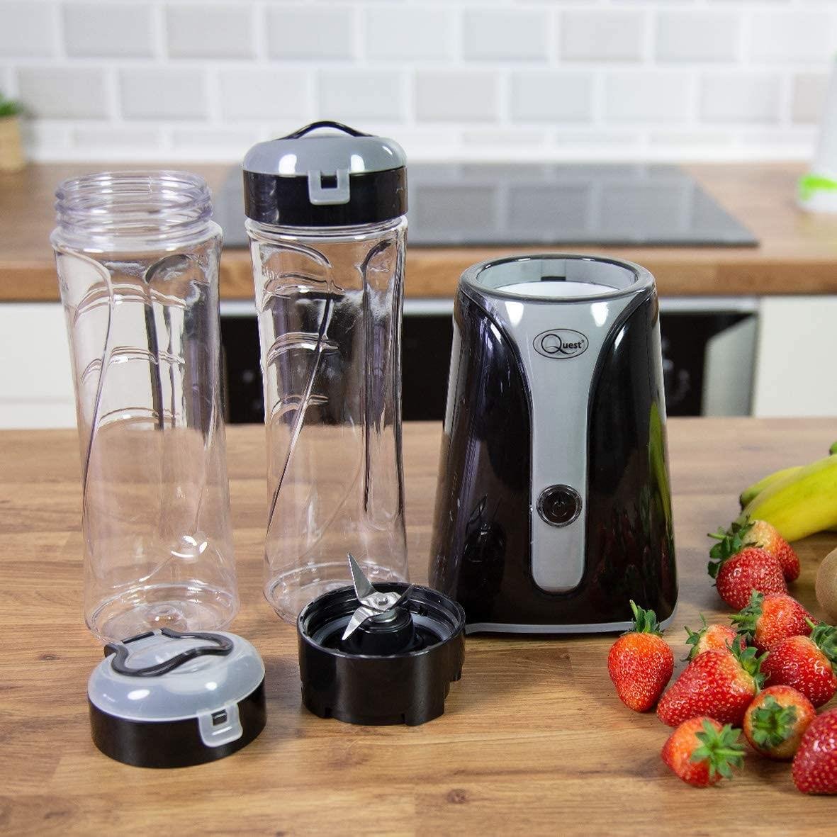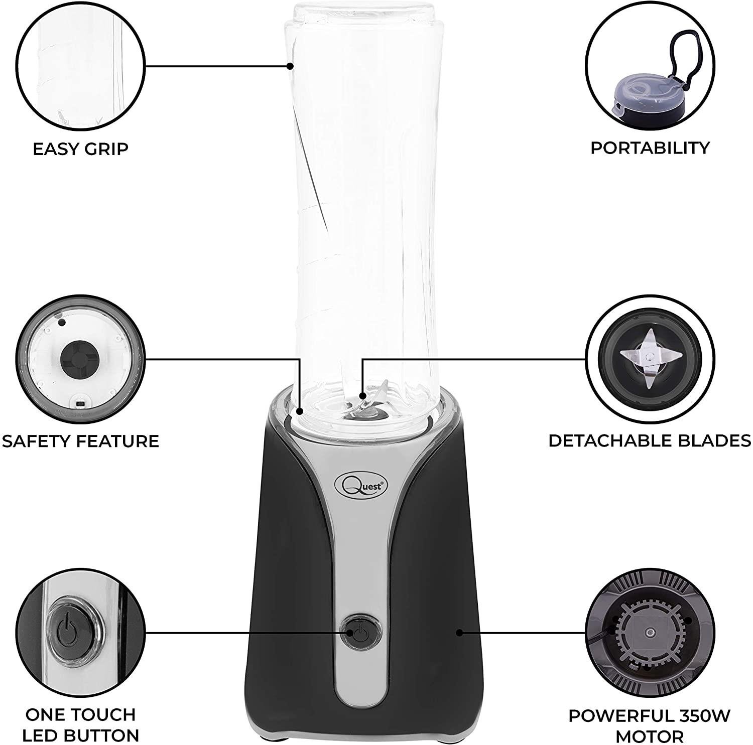 • QUEST PERSONAL BLENDER – Make your favourite drinks in minutes with this slimline, personal blender. It comes with two, BPA-free bottles so you can make two batches of any drink of your choice. As the blender attaches straight to the bottle for your convenience, there is no need to transfer your drink once it is mixed – just add your ingredients, blend and enjoy.