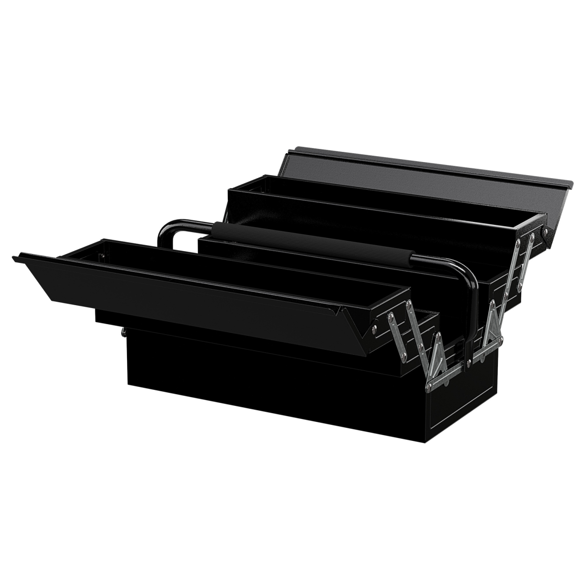 Features: • Great for homes, offices, warehouses and workplaces • 5 collapsible trays offer ample storage space for your tools and parts • Create the most effective way to organize your frequently used tools • Easy-to-grip handle with EVA makes transportation a snap • Made of robust steel and covered with powder coating for rust resistant Specification: • Colour: Black • Material: Steel (SPCC) • Overall Dimension: 17.7″ W x 7.9″ D x 13.6″ H (45 x 20 x 34.5 cm) • Unfolding Dimension: 27.2″ L x 17.7″ W x 9.1″ H (69 x 45 x 23 cm) • Small Tray Dimension: 16.3″ L x 3.7″ W x 2″ D (41.5 x 9.5 x 5 cm) • Large Tray Dimension: 16.3″ L x 7.9″ W x 3.9″ D (41.5 x 20 x 10 cm) • Weight Capacity: 44 lbs (20 kg) Package Includes: • 1 x Tool Box • 1 x Manual